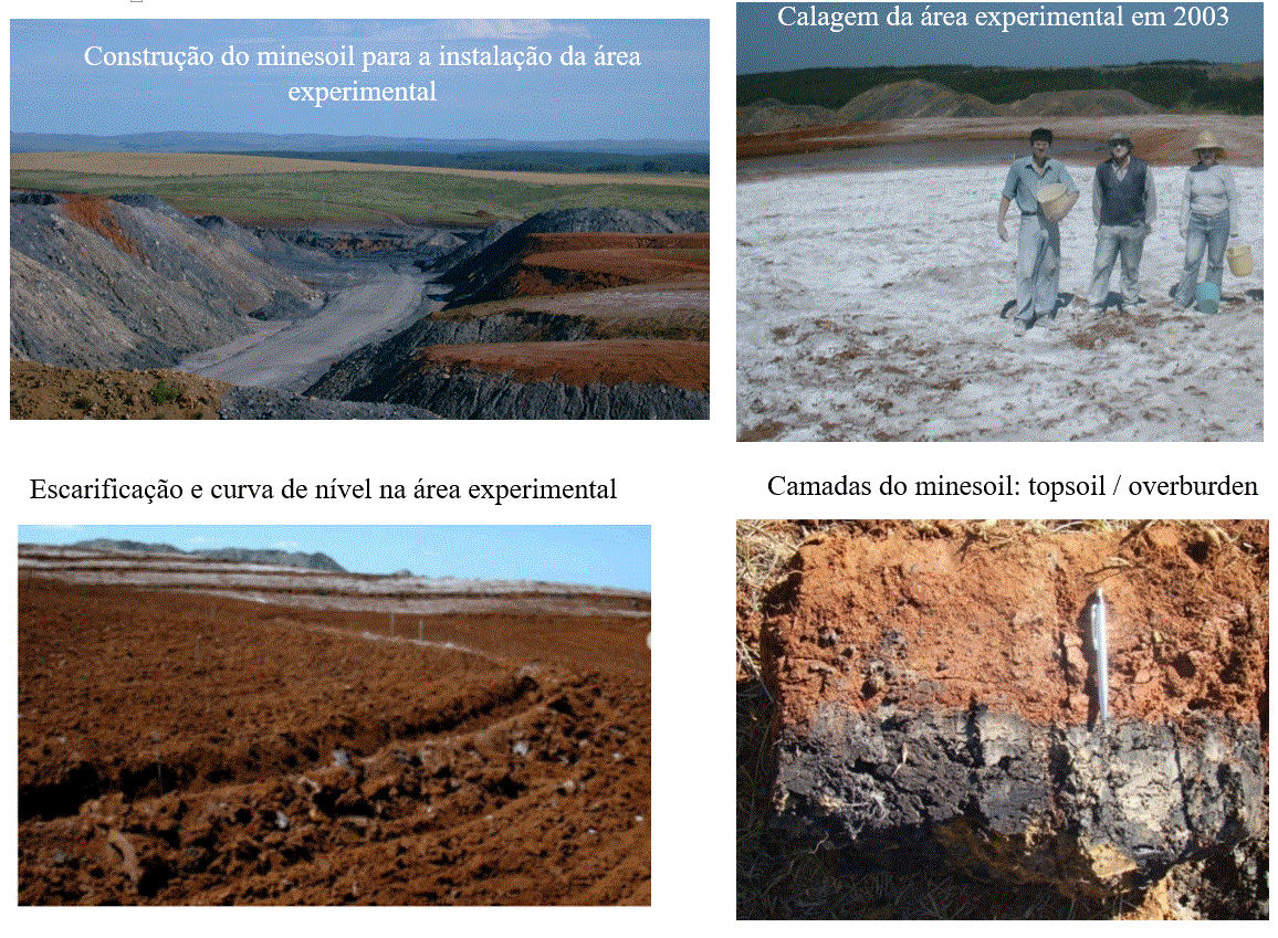 Em 2003, o DS da FAEM-UFPel, em conjunto com técnicos da área ambiental da CRM, selecionou uma área recém-minerada para a instalação de um experimento de longa duração, visando testar vegetais promissoras (poáceas e fabáceas), já conhecidas como promissoras na recuperação de áreas agrícolas, recuperação de áreas impactadas pela mineração de carvão. A recomposição topográfica do minesoil da área experimental consistia de 40 cm de material argiloso, retirado de um horizonte B do solo natural da frente de lavra (chamado de topsoil), recolocado sobre a camada de esteréis (rochas e carvão não aproveitados para a queima), (chamado de overburden).