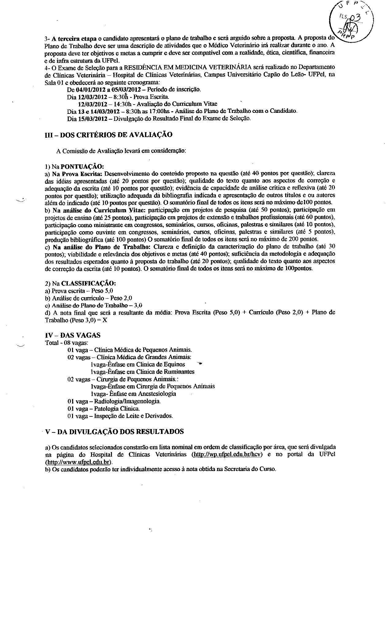 Estará aberto, no período de 4 de janeiro a 5 de março de 2012, o período de inscrições para o processo seletivo de Residência Médico-Veterinária, cujas provas serão realizadas nos dias 12, 13 e14 de março. As inscrições podem ser feitas no Departamento de Clínicas Veterinárias, no horário das 8h às 11h30min. Consultas pelo email residenciavetufpel@hotmail.com ou pelo telefone (53) 3275-7506.