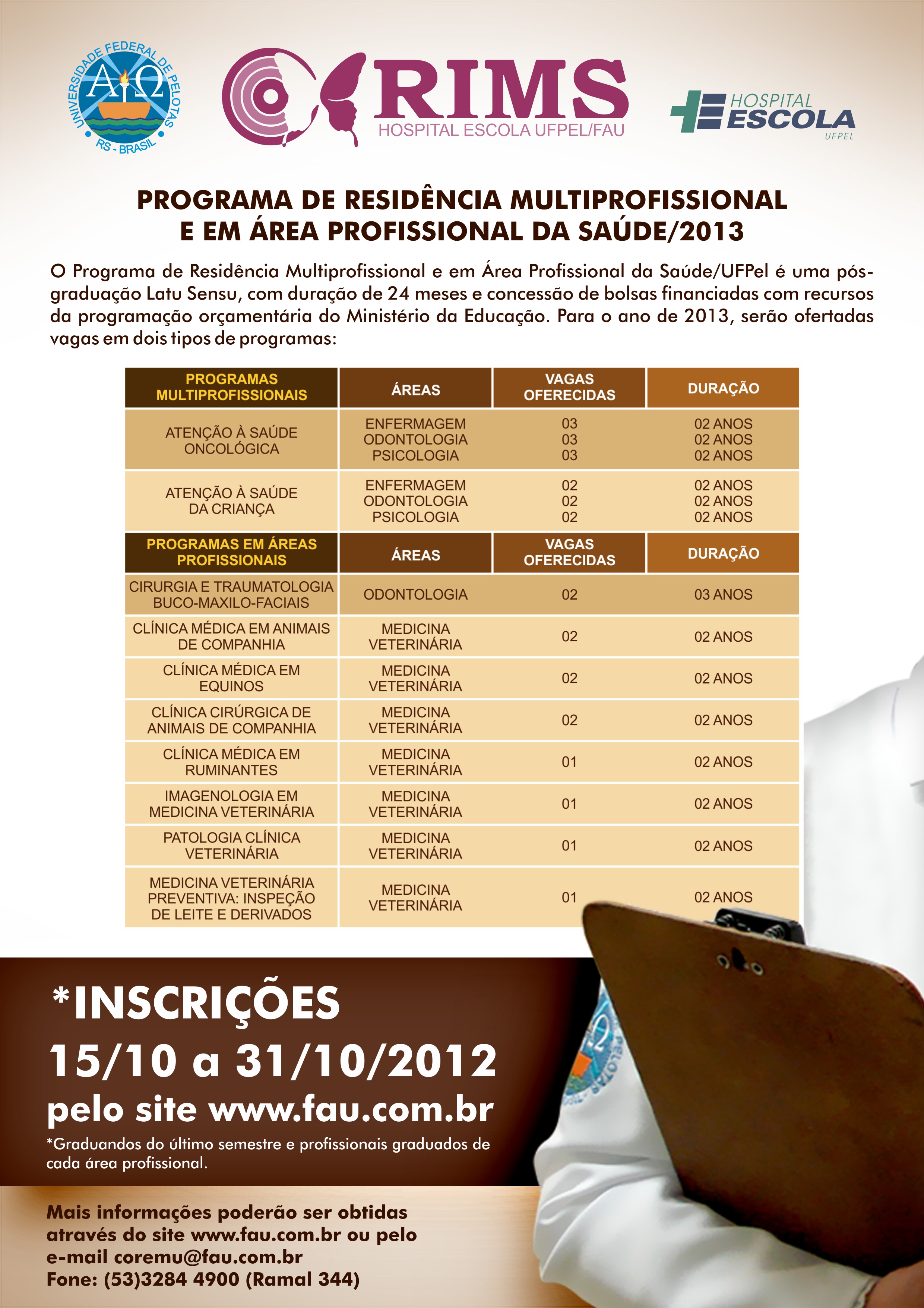 Está aberto o edital de seleção para Residência Multiprofissional e em Área da Saúde, onde a Medicina Veterinária dispõe de 10 vagas divididas em áreas, e com ingresso para março de 2013.