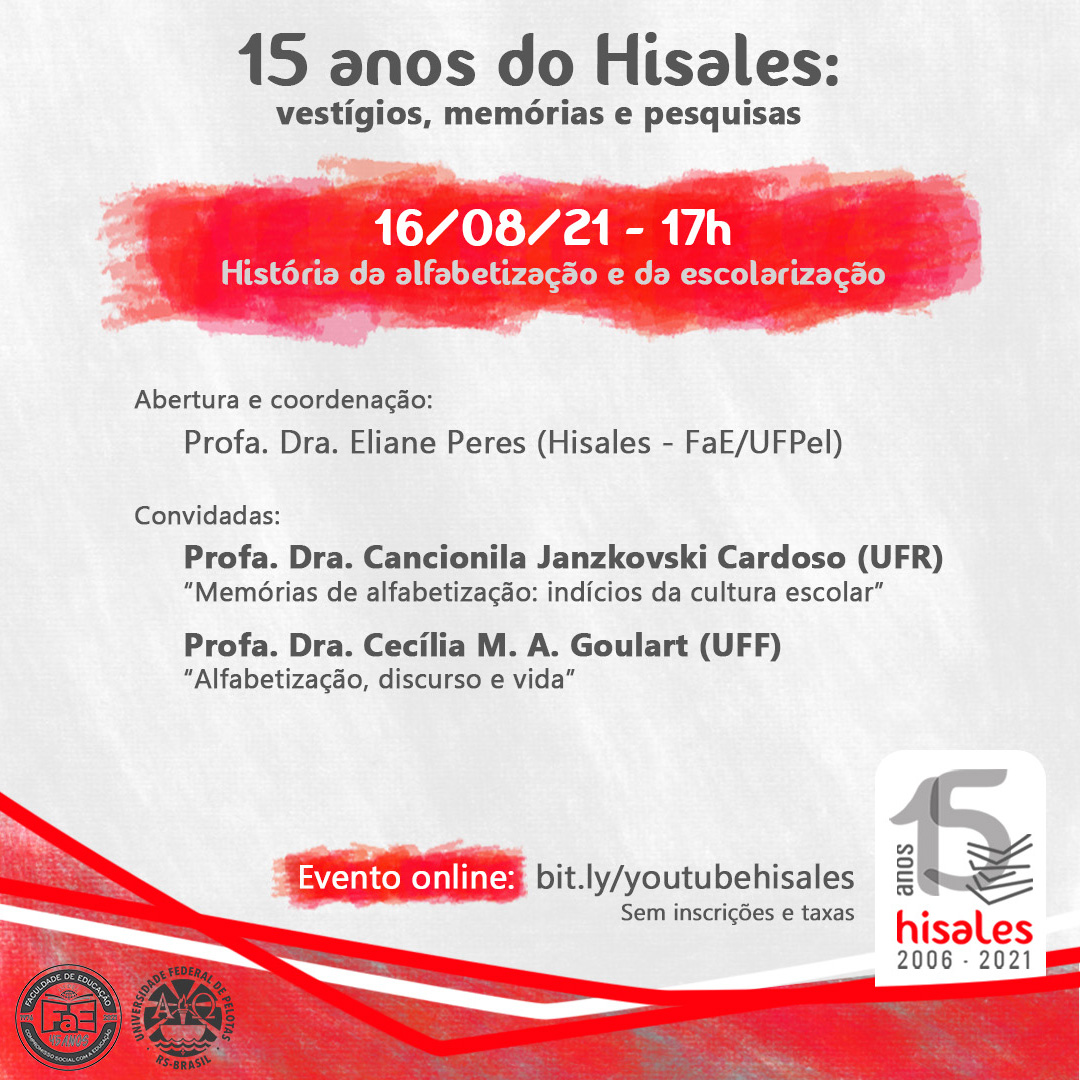 A partir de agosto, será realizado o evento “15 anos de Hisales: vestígios, memórias e pesquisas”, formado por 3 encontros mensais baseados nos principais eixos de investigação do Hisales, com a participação de professoras pesquisadoras, que apresentarão temáticas afins.