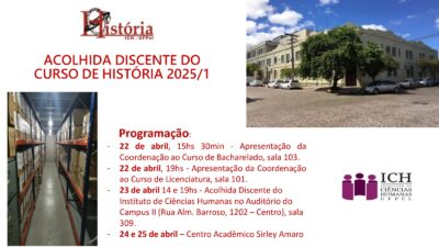 23 de abril – tarde Acolhimento às(aos) discentes dos cursos de História – Bacharelado e Museologia Horário: 14hs. Local: Auditório do Campus II (Rua Alm. Barroso, 1202 – Centro), sala 309. Programação: 14hs – Abertura: Reitoria, Direção, Coordenadoras(es) e Secretárias(os); 14hs 30min – Pró Reitoria de Ensino; 15hs – Pró Reitoria Assuntos Estudantis; 15hs 30min – Pró Reitoria de Ações Afirmativas e Equidade; 16hs – Bibliotecas; 16hs 30min – Encerramento: Coordenadoras(es) dos cursos e Centros Acadêmicos. 23 de abril – noite Acolhimento às(aos) discentes dos Cursos de […]