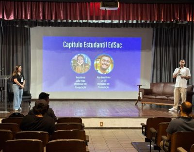 A presidente da EdSoc Student Chapter UFPel, Júlia Veiga, e seu Vice-Presidente, Lui Gill, realizaram uma apresentação sobre o Student Branch!