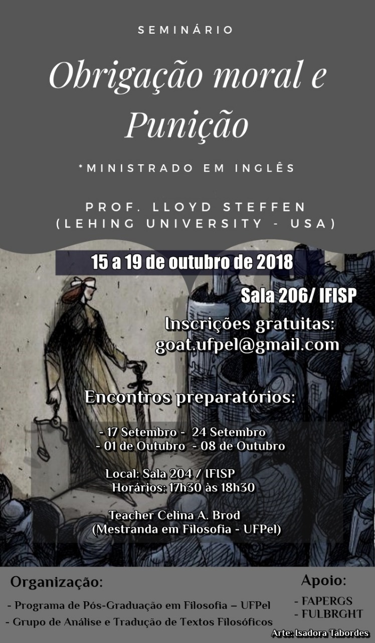 O Programa de Pós-Graduação em Filosofia promove o evento ‘Obrigação Moral e Punição’ com o Professor Lloyd Steffen (Lehigh University – USA). O mesmo ocorrerá de 15 a 19/10, das 14 às 17:30, na sala 206 do IFISP.