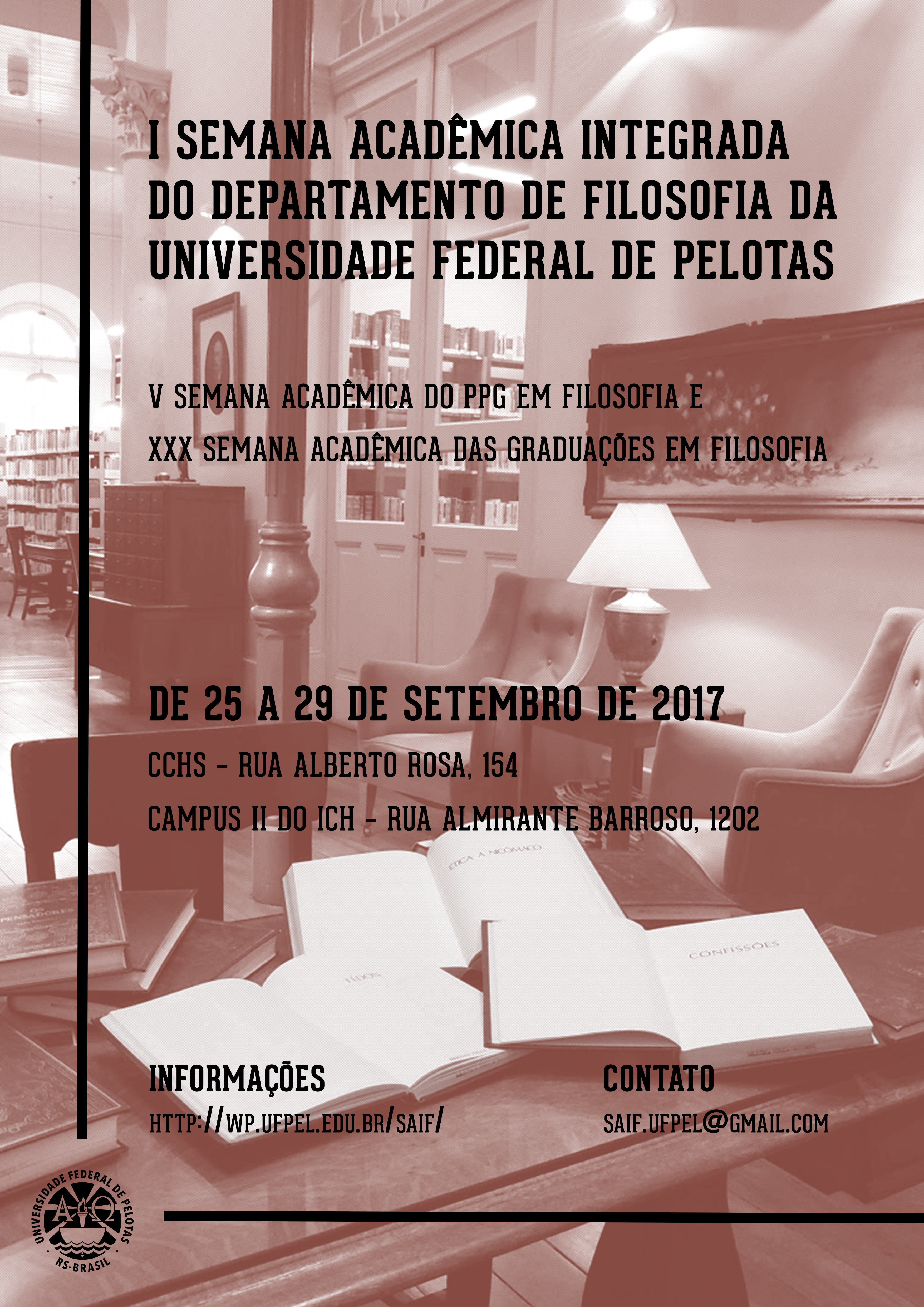 De 25 a 29/09 de 2017 ocorrerá a I Semana Integrada da Filosofia IFISP – UFPel, correspondendo à XXX Semana Acadêmica dos Cursos de Graduação em Filosofia e à V Semana Acadêmica do PPG em Filosofia.