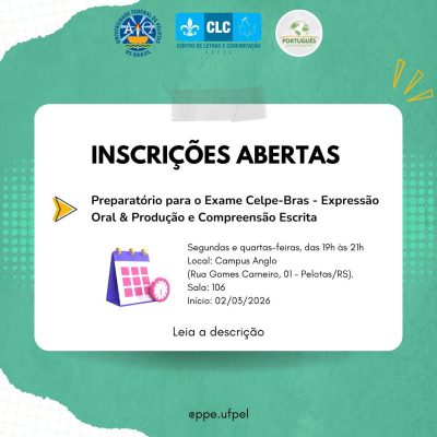 O Programa Português para Estrangeiros (PPE) da Universidade Federal de Pelotas (UFPel) informa que estão abertas as inscrições para o curso “Preparatório para o Exame Celpe-Bras – Expressão Oral & Produção e Compreensão Escrita”.