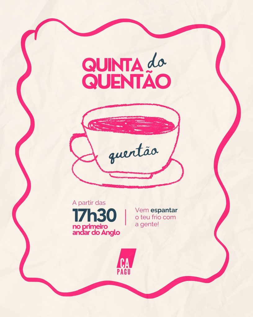 Para mais informações, acesse as redes sociais do CA PAGU. A quinta do quentão acontece todas as quintas-feiras às 17:30, no primeiro andar do Campus Anglo.