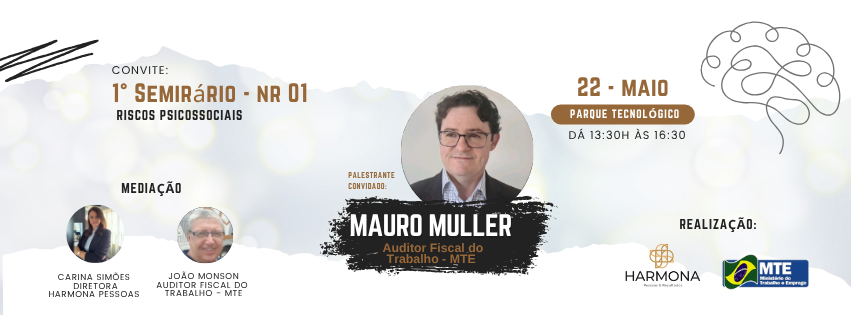 Harmona & Ministério do Trabalho e Emprego – Pelotas/RS, tem o prazer de convidá-los para o 1° Seminário NR 01 – Riscos Psicossociais, com palestrante o SR. Mauro Muller – Auditor Fiscal do Trabalho do Ministério do Trabalho e Emprego – MTE/RS, que falará sobre o tema: “Riscos psicossociais na NR-1: na prática, o que as organizações precisam fazer a partir de agora? O que será cobrado nas fiscalizações?“.