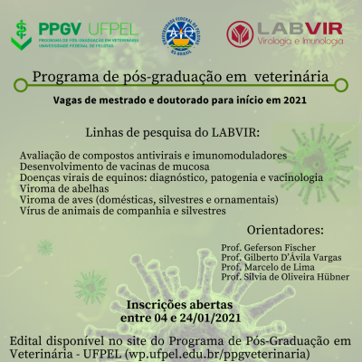 No dia 20 de dezembro de 2019 foi realizada a defesa de dissertação de Alice Silveira Becker, intitulada “Detecção molecular de Alphaherpesvirus felideo 1 e Calicivirus felino em gatos domésticos”, sob orientação da prof. Dra. Silvia de Oliveira Hübner e coorientação da Dra. Francielle Liz Monteiro.
