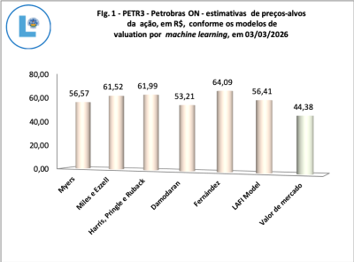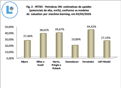 Ao observarmos a figura 2, notamos que o citado modelo de Damodaran (1994) registrou o menor upside para PETR3, que foi estimado em 19,89%. O nosso LAFI Model estimou um upside de 27,10% e a projeção mais otimista foi a do modelo de Fernández (2004 e 2008), que registrou 44,42%. De qualquer modo, ressaltamos que todos os modelos geraram upsides positivos e que, em nossa perspectiva, o cenário de turbulência no mercado mundial de petróleo pode acelerar a valorização da ação e fazer com que ela chegue rapidamente ao seu valor intrínseco mais conservador. Isto é, o papel pode chegar a exibir uma alta de 19,89%, conforme prevê o modelo de Damodaran.