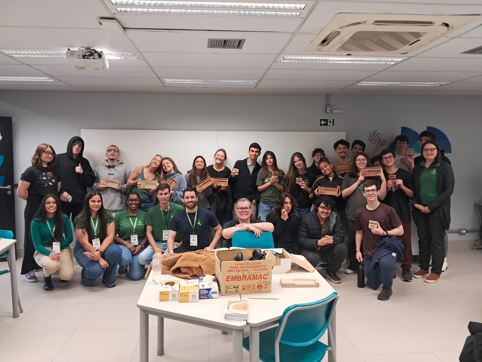 Figura 01 – Turma de 3º Ano da Escola SESI Pelotas com seus pequenos objetos em madeira – POM e a equipe da UFPel que ministrou a oficina.