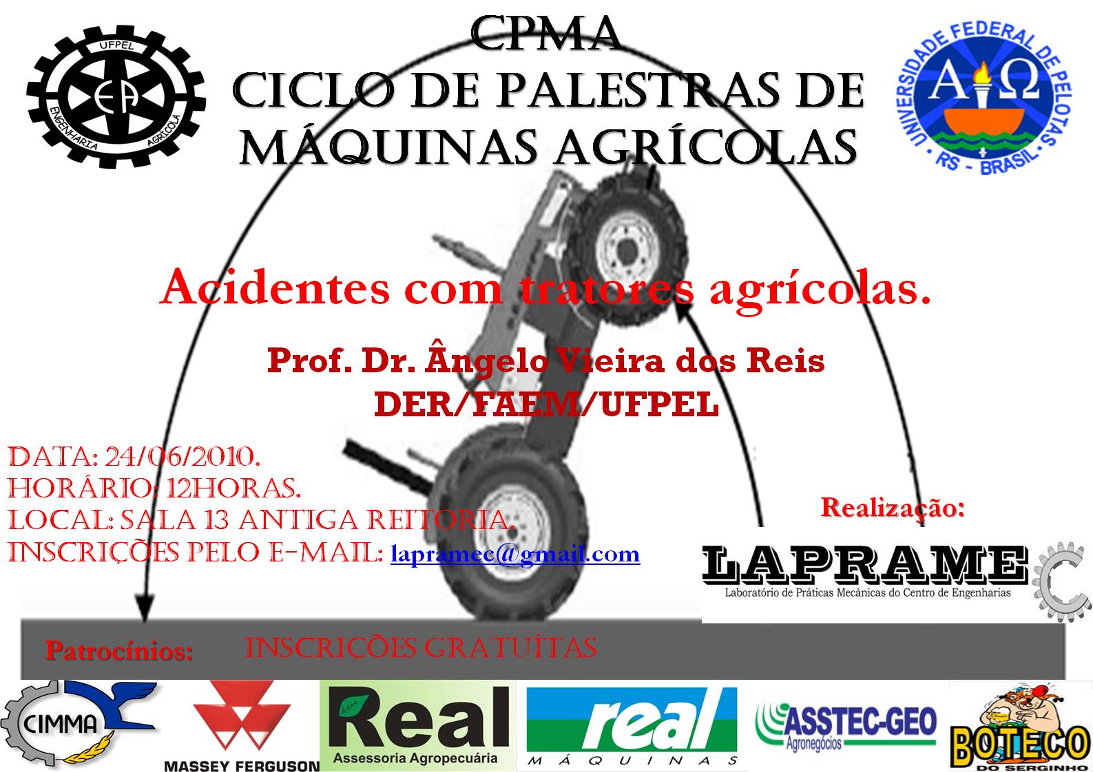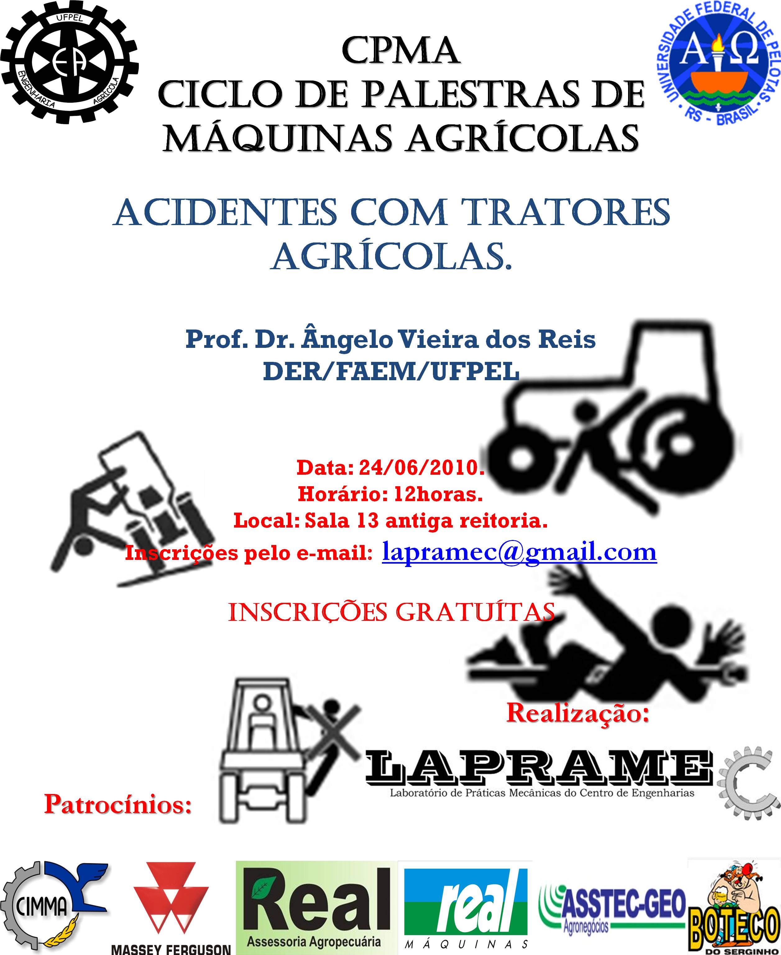 A segunda palestra do CPMA foi proferida pelo Prof. Dr Angelo Vieira dos Reis do Departaemtno de Engenharia Rural da Universidade Federal de Pelotas – UFPEL. A Paletra foi intitulada Acidentes com Tratores AgrÃcolas e teve a presença de 102 participantes.