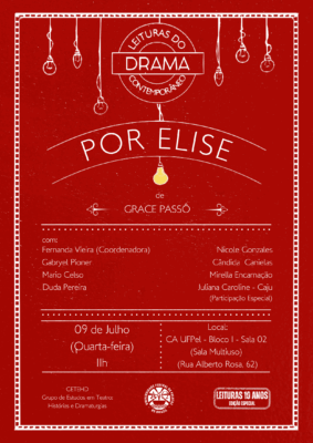 Dando sequência às (re)leituras comemorativas alusivas aos 10 anos do projeto, vamos apresentar a leitura dramática de “Por Elise”, de Grace Passô, texto teatral lido pelo projeto em 19 de novembro de 2017. A leitura contará com a participação de uma aluna egressa do curso de Teatro da UFPel, que leu o texto na ocasião passada e que faz parte da formação original do Leituras do drama contemporâneo, Juliana Caroline (Caju).