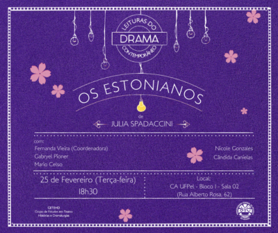 Os estonianos, de Julia Spadaccini Leitura dramática Data: 25/02/2024 (terça-feira) Horário: 18h30min Local: Sala 2 – Bloco 1 – Centro de Artes (Rua Alberto Rosa 62) Entrada franca Sinopse: Os estonianos traz cinco personagens em crise com o mundo moderno, que lutam cada um à sua maneira contra a solidão, e que, ao verem suas vidas entrelaçadas pelo acaso, procuram encontrar formas de lidar com a incomunicabilidade e a insatisfação que pesam sobre suas relações. Leitores e leitoras: Cândida Canielas, Fernanda Vieira Fernandes, Gabryel […]