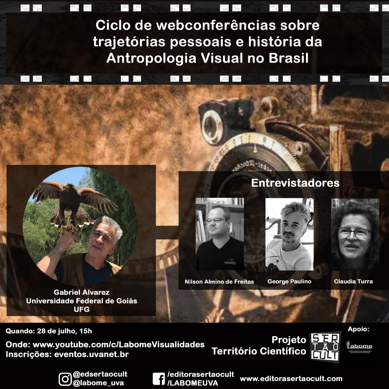Vinculado ao projeto “Territórios científicos” da Editora Sertão Cult em parceria com a LABOME, promovemos uma série de entrevistas e, ao mesmo tempo, webconferências sobre trajetórias pessoais de pesquisadores que atuam na rede de antropologia visual no Brasil. A proposta, além de ter a finalidade de divulgar o que se produz neste campo, também tem como objetivo publicar as entrevistas em ebook e disponibilizar para o público interessado.