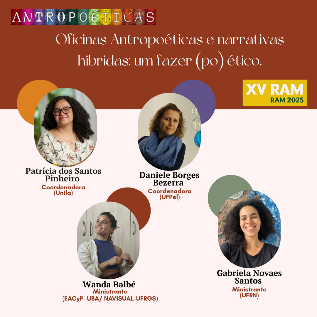 Oficinas Antropoéticas: Narrativas hibridas: um fazer (po) ético. Publicado em 04/06/2025 por antropologia O Antropoéticas estará na XV Reunião de Antropologia do Mercosul, em Salvador/BA, na Oficina Antropoéticas e narrativas híbridas: um fazer (po)ético. Inscrições pelo site https://www.ram2025.sinteseeventos.com.br/ Compartilhe isso: Clique para compartilhar no X(abre em nova janela) 18+ Clique para compartilhar no Facebook(abre em nova janela) Facebook Curtir isso:Curtir Carregando... Relacionado