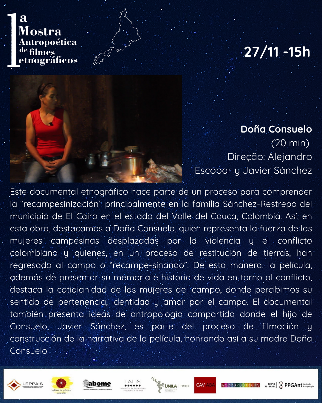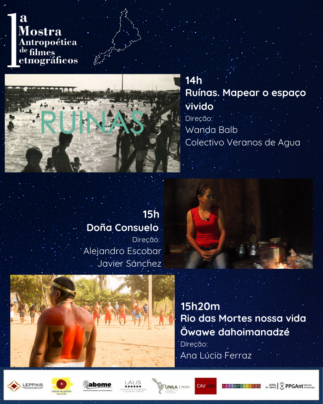 Os filmes foram seguidos por uma conversa online com os diretores: Ana Lúcia Ferraz (professora UFF) Wanda Balbé (dr UBA), Alejandro Ecobar (doutorando UFRJ) Javier Restrepo, Patrícia Pinheiro (professora UNILA).