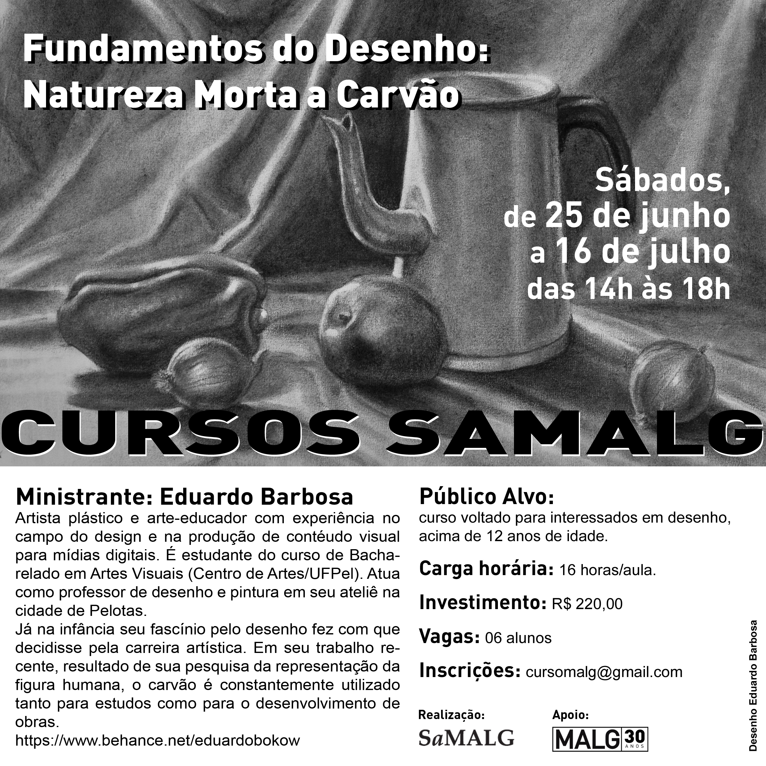 Estão abertas as inscrições para o curso de Fundamentos de Desenho: natureza morta a carvão, do artista Eduardo Barbosa.O Curso ocorrerá aos sábados, nos dias 25 de junho, 02, 09 e 16 de julho, das 14h às 18h, no Museu de Arte Leopoldo Gotuzzo (General Osório, 725, esquina General Neto).