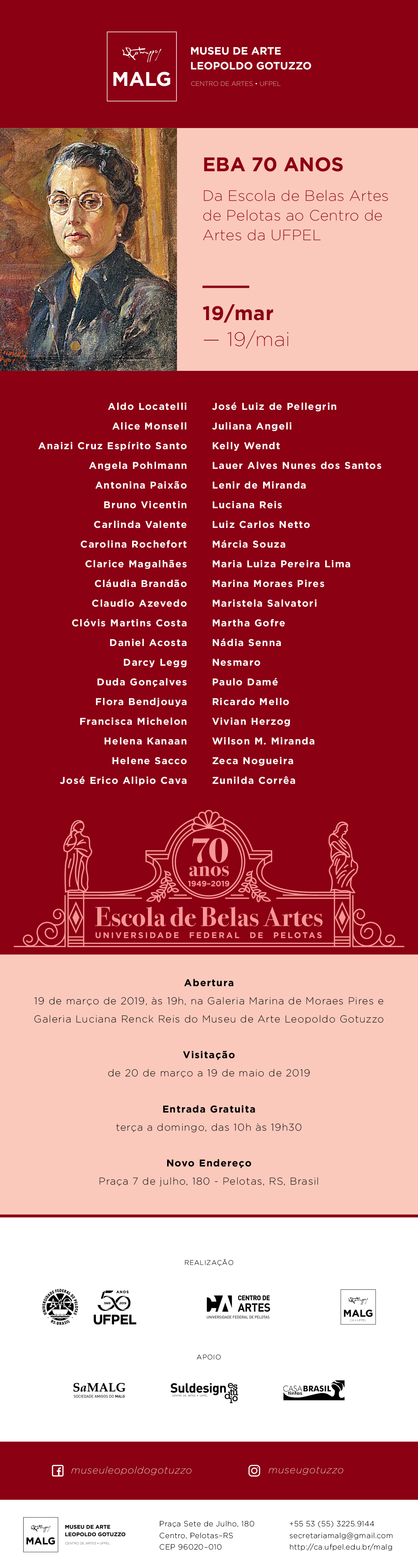 Exposição comemorativa aos 70 anos de fundação da Escola de Belas Artes de Pelotas com obras dos professores-artistas que atuaram na instituição desde a sua fundação até os dias atuais. A exposição ocupa as galerias Marina de Moraes Pires e Luciana Renk Reis.