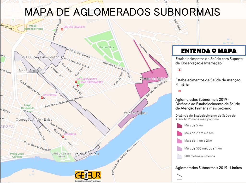 Nos mapas a seguir vemos informações sobre comunidades de baixa renda em Pelotas. Mostramos índices de concentração de pessoas (densidade demográfica e habitantes por quarto), percentual de maiores de 60 anos e distância em relação a Estabelecimento de Saúde de Atenção Primária (Unidades Básicas de Saúde, UBS) e Estabelecimentos de Saúde com Suporte de Observação e Internação.
