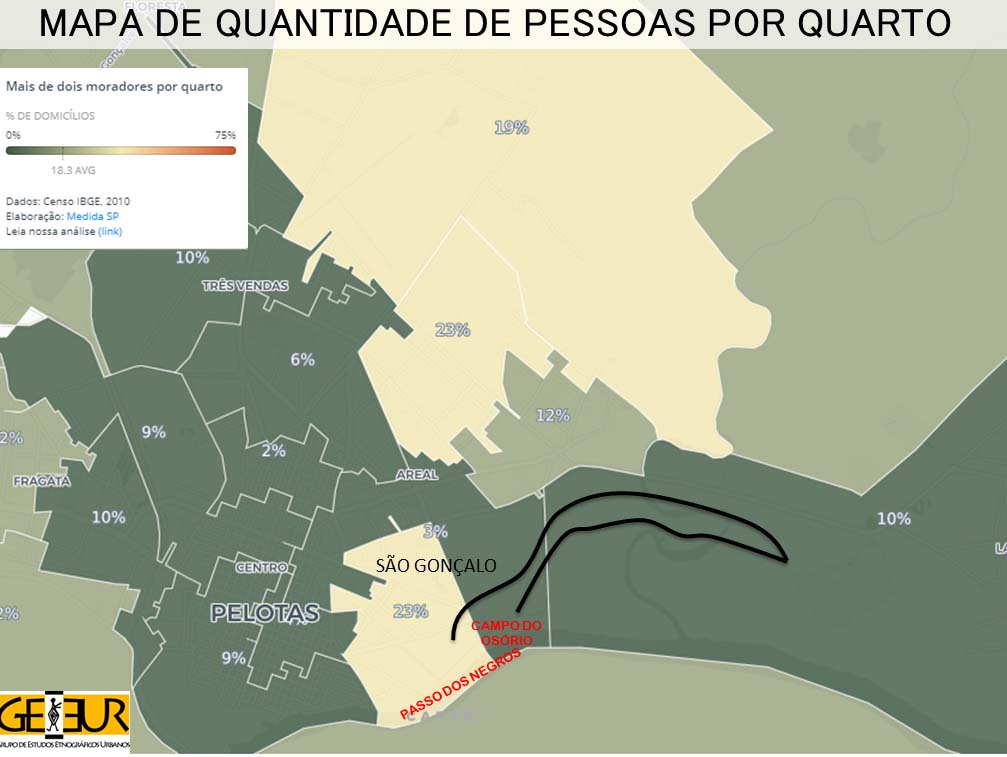 Este mapa diz respeito aos índices de casas com dois (ou mais) moradores por quartos. Desta forma, quanto maiores os índices no mapa, maior a concentração de pessoas em uma residência e consequentemente em um quarto