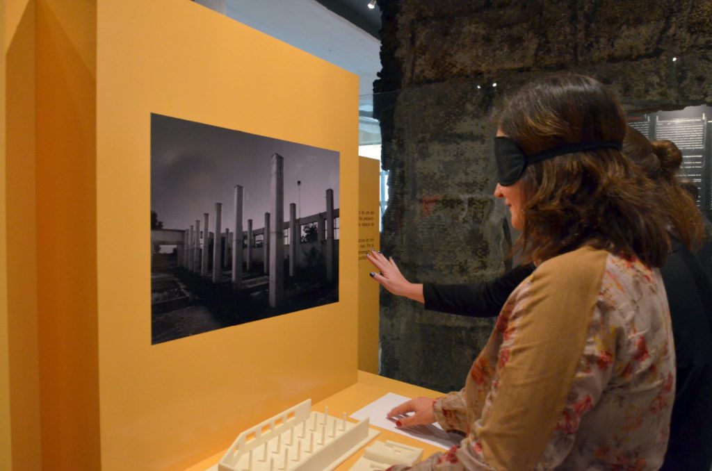 - Vista do Memorial com recusos (maquetes e esquemas táteis, legendas em braille). Observar que o mobiliário foi desenhado para uso também de cadeirantes e as cores dos painéis decorrem de pesquisa com pessoas com baixa visão.