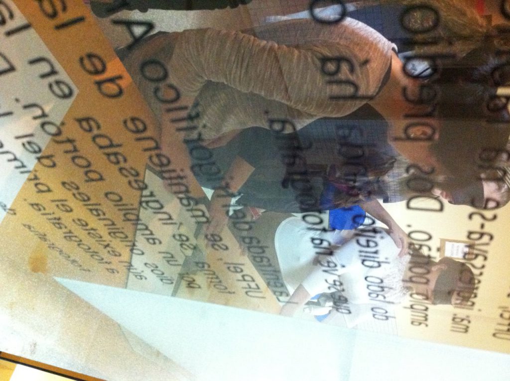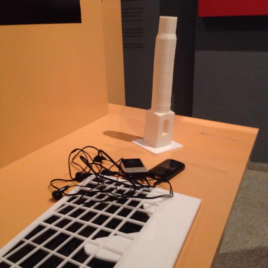- Dispositivo para ser utilizado pelo visitande para audição da audiodescrição das fotografias, junto à maquete da chaminé da fábrica e esquema da janela. Ambas são vistas na fotografia.