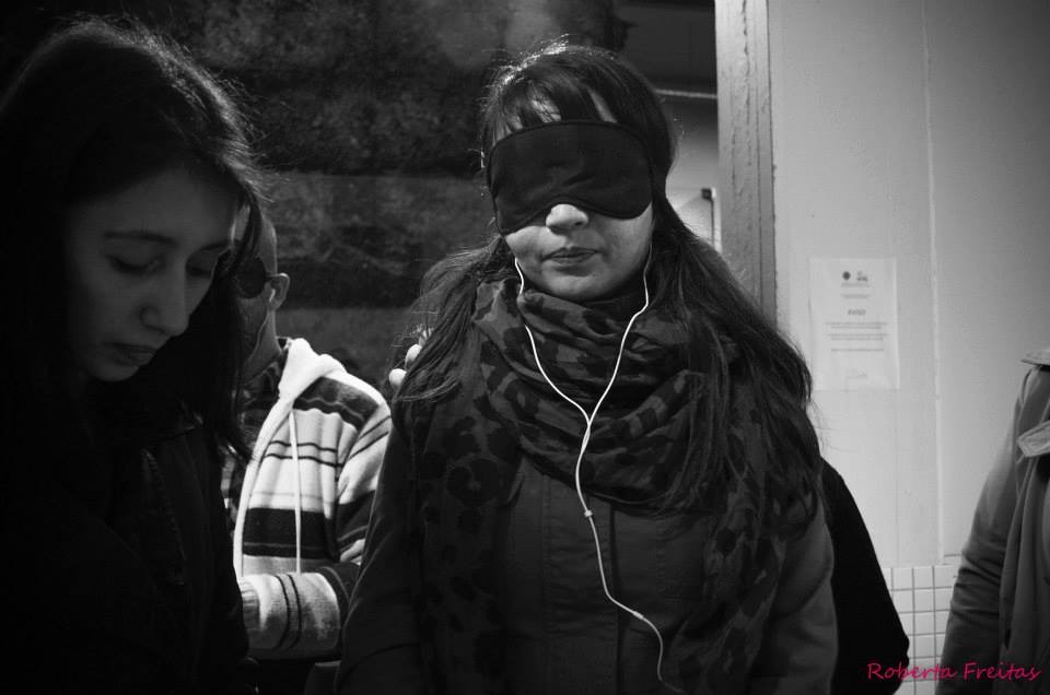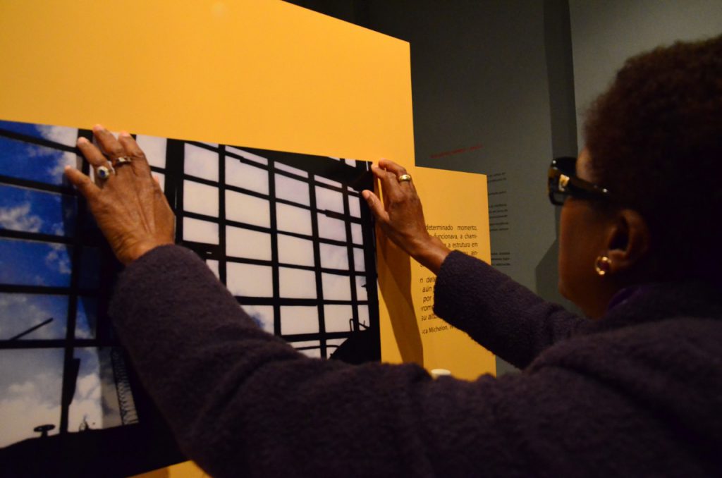 - Visitante com venda nos olhos experimenta esquemas táteis da fotografia em exposição.