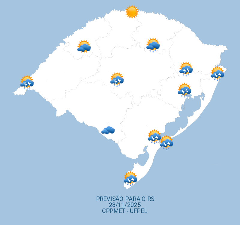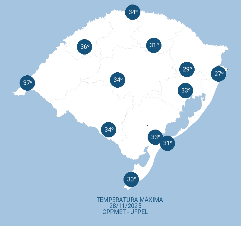 Nesta sexta-feira, a passagem de uma frente fria pelo oceano, favorece a formação de áreas de instabilidades com possibilidades de pancadas isoladas de chuva e trovoadas principalmente na metade leste do estado. Com o forte aquecimento a partir do meio do período áreas de instabilidade podem gerar pancadas isoladas e trovoadas na maior parte das regiões do estado e temperaturas máximas que excedem os 35°C em pontos da metade oeste e Vale Central.
