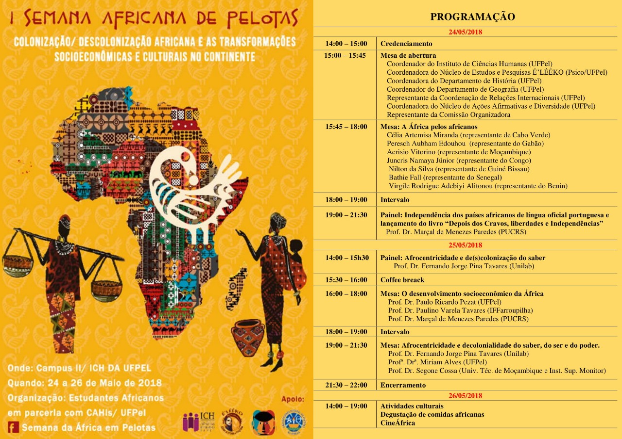 Ao decorrer destes três dias, frisaram a importância dos alunos da UFPEL saírem do Brasil para a África em mobilização, assim tendo contato direto com a cultura, vocabulário, educação, empreendedorismo, saúde do continente. A programação do último dia (26) sábado, iniciou com uma tarde de apresentação do “Cine África”, realizado na R. Lôbo da Costa, 447 – Centro, Pelotas , logo após no antigo Restaurante Universitário da XVI, realizou-se degustação de comidas típicas (cachupa) e encerramento com atividades culturais, dentre elas um desfile de moda do projeto KANIMAMBO- Ateliê vestuário Africano.