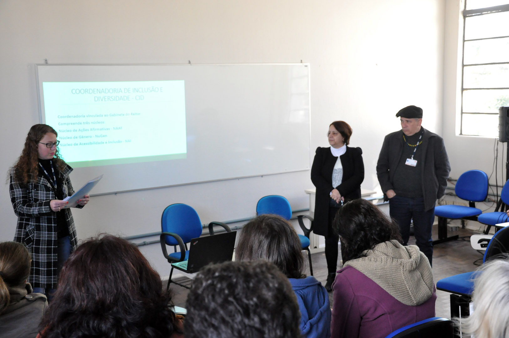 No encontro a chefe do NAI professora Rita Cóssio elencou as duas sessões que compõem atualmente o Núcleo: A Seção de Interpretes e a Seção de Atendimento Educacional Especializado, sob as chefias das respectivas técnicas administrativas Nádia Porto e Mirian Bohrer. As servidoras presentes nesta visita fizeram uso do espaço para exporem as atividades e os encaminhamentos que são realizados por intermédio da existência e da atuação de suas seções.