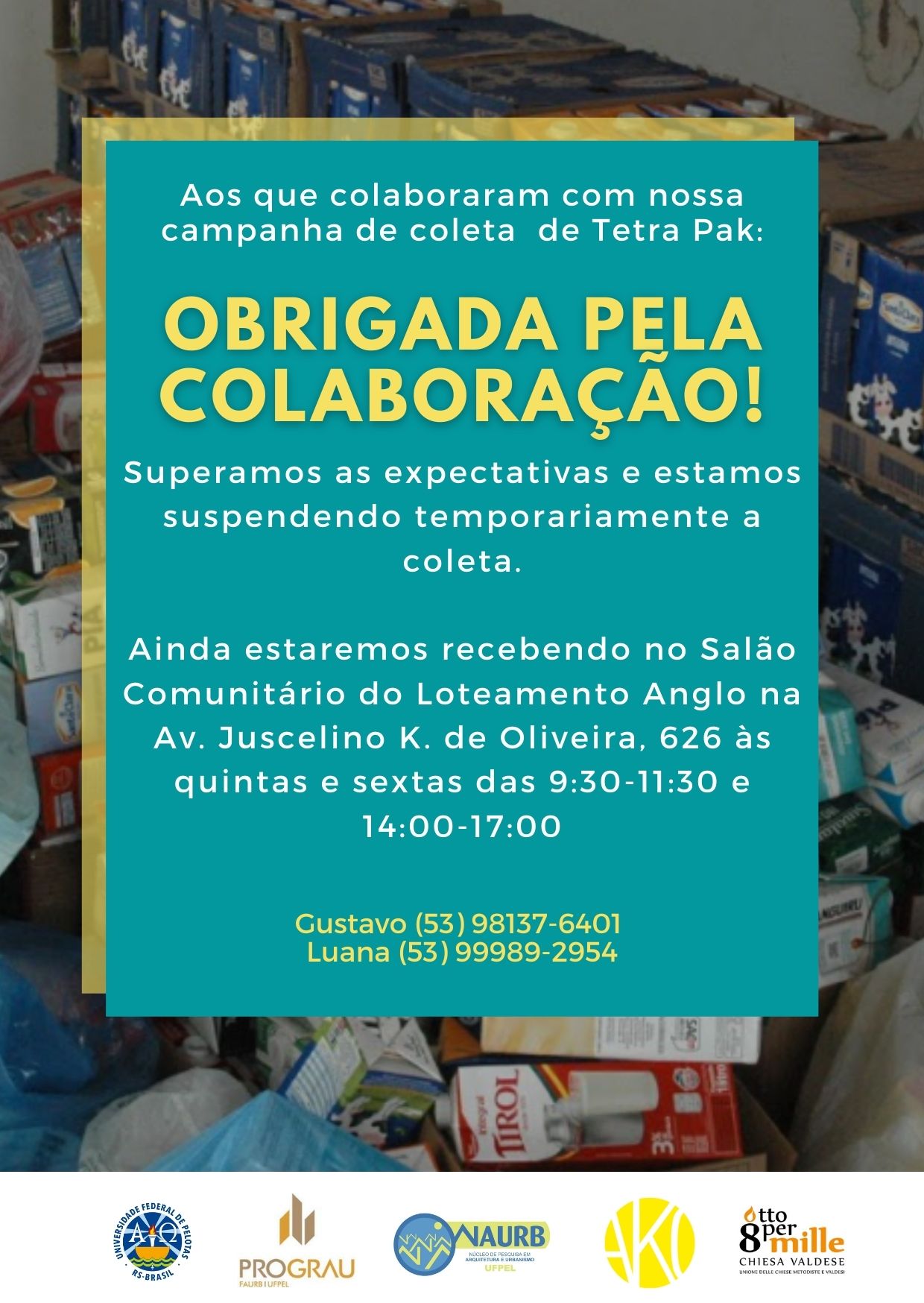 Gostaríamos de agradecer à todos que participaram da nossa campanha de arrecadação de embalagens Tetra Pak. Tivemos um grande envolvimento da comunidade e conseguimos superar nossa meta, por conta disso estamos suspendendo temporariamente a coleta das embalagens e recebendo as últimas unidades diretamente no salão comunitário do Loteamento Anglo, localizado na Av. Juscelino k. de Oliveira, 626 às quintas e sextas das 9:30 – 11:30 e das 14:00 – 17:00.