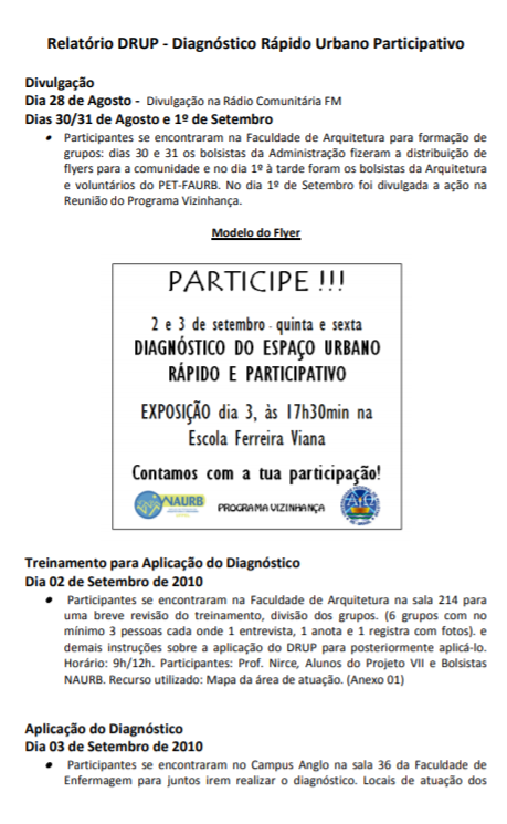 Este relatório expõe o processo de Diagnostico Rápido Urbano Participativo (DRUP), ferramenta que auxilia nos métodos participativos, sendo utilizado no Projeto de Qualificação Urbana, projeto de extensão vinculado ao Programa Vizinhança.