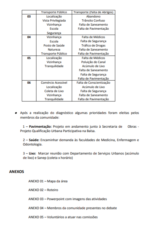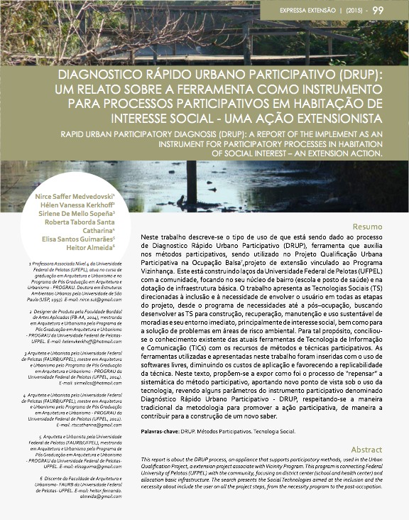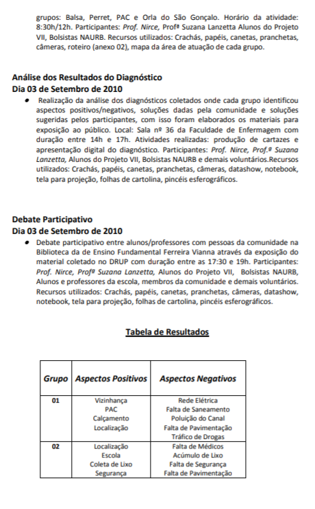 Para tal propósito, conciliou-se o conhecimento existente das atuais ferramentas de Tecnologia de Informação e Comunicação (TICs) com os recursos de métodos e técnicas participativos.. As ferramentas utilizadas e apresentadas neste trabalho foram inseridas com o uso de softwares livres, diminuindo os custos de aplicação e favorecendo a replicabilidade da técnica. Neste relatório, propõem-se a expor como foi o processo de “repensar” a sistemática do processo participativo, aportando novo ponto de vista sob o uso da tecnologia, revendo alguns parâmetros do instrumento participativo denominado Diagnóstico Rápido Urbano Participativo – DRUP, respeitando-se a maneira tradicional da metodologia para promover ação participativa, de maneira a contribuir para a construção de um novo saber.