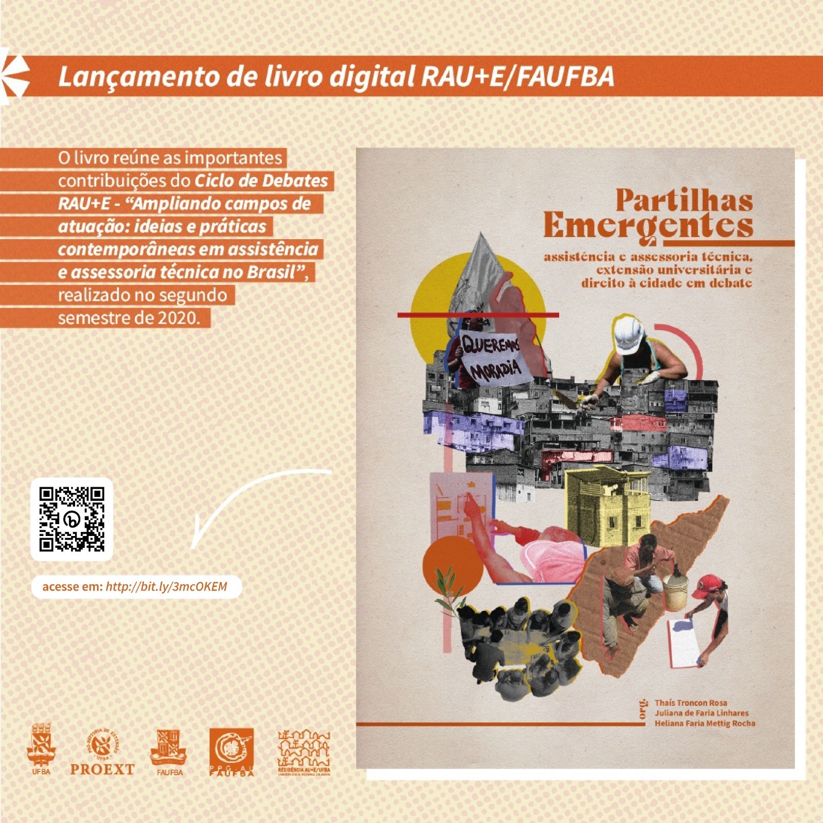 “É com muita alegria que compartilhamos, finalmente, o livro Partilhas Emergentes: assistência e assessoria técnica, extensão universitária e direito à cidade em debate.
