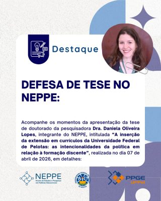 O NEPPE vem a público divulgar a defesa da tese de doutorado da pesquisadora Daniela Oliveira Lopes, integrante do grupo, realizado em 7 de abril de 2026, na Sala de Audiência do CEHUS da Universidade Federal de Pelotas (UFPel).