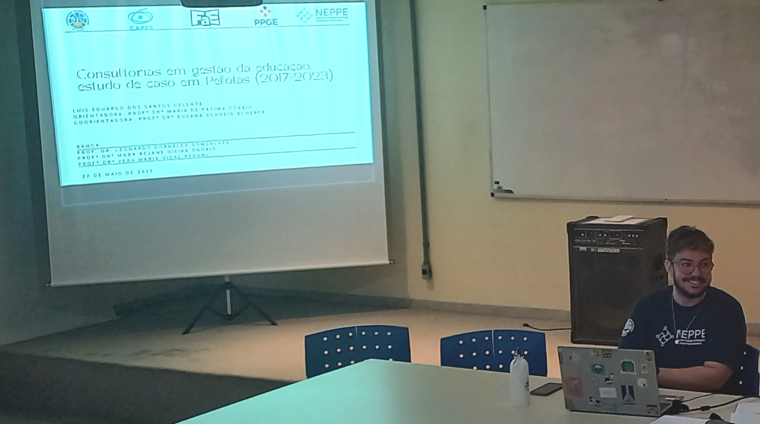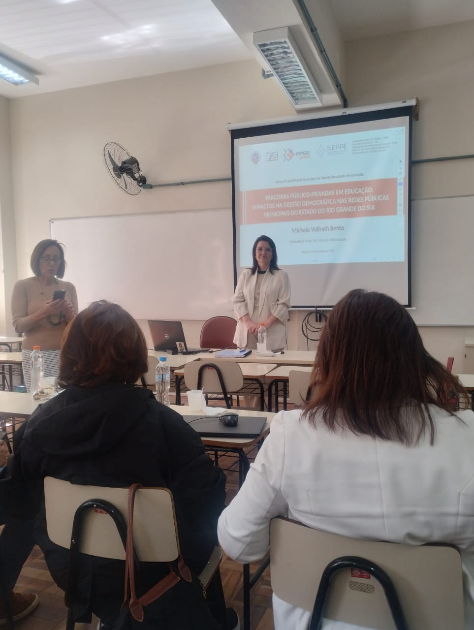 Na tarde de 31 de outubro de 2025, ocorreu o exame de Qualificação de Doutoramento da integrante do NEPPE, Michele Vollrath Bento, sob o título “Parcerias público-privadas em educação: impactos na gestão democrática nas redes públicas municipais do Estado do Rio Grande do Sul”, sob orientação da Profª Drª Maria de Fátima Cóssio.