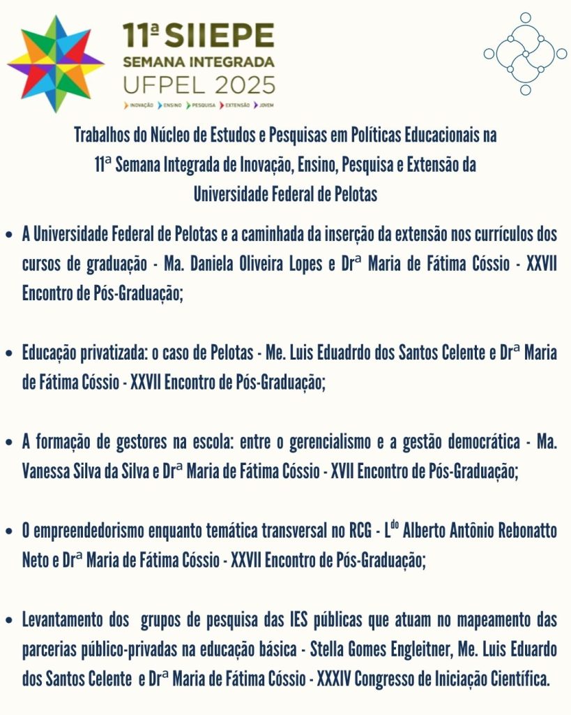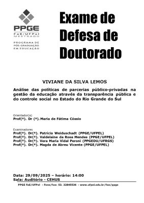 Na tarde de 29 de setembro de 2025, ocorreu o exame de Defesa de Doutorado da integrante do NEPPE, Viviane da Silva Lemos, sob o título “Análise das políticas de parcerias público-privadas na gestão da educação através da transparência pública e do controle social no estado do Rio Grande do Sul”, sob orientação da Profª Drª Maria de Fátima Cóssio.