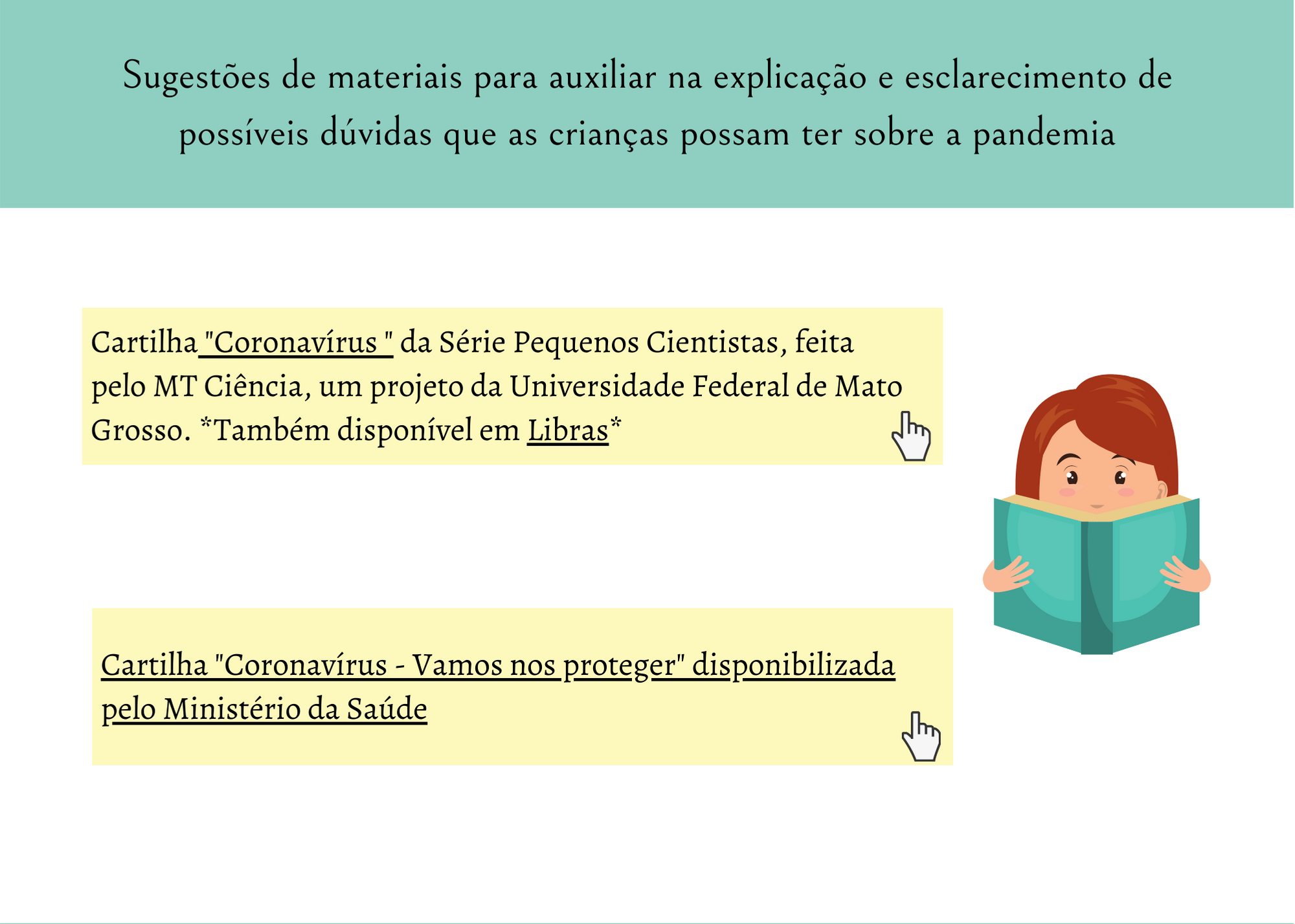 As ações do projeto envolveram a elaboração de materiais educativos com foco em diferentes grupos populacionais. Foram 11 trabalhos produzidos individualmente ou em grupo em formato de posts para redes sociais (imagem e/ou vídeo), cartilhas e jornais informativos e podcast.
