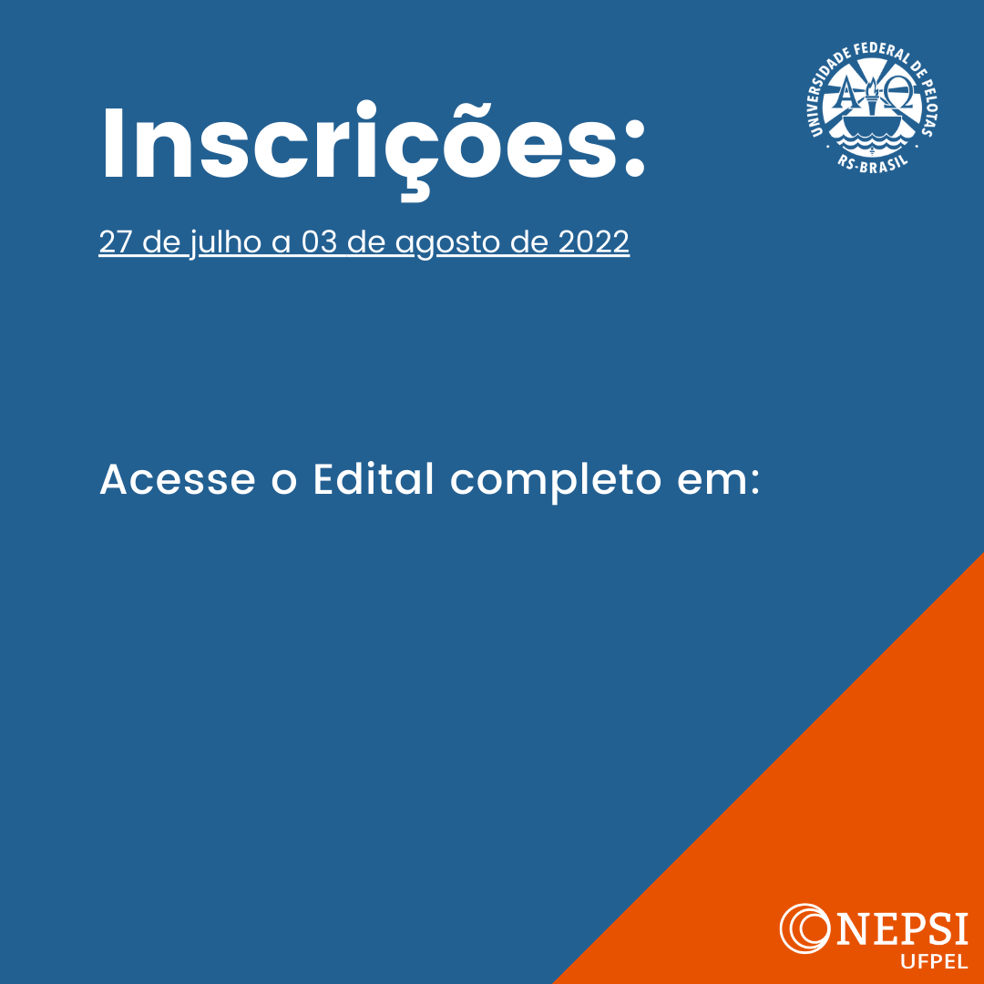 As inscrições ao Exame de Seleção para cursar disciplina optativa como estudante especial do Programa de Pós-Graduação em Enfermagem da UFPel estarão abertas no período de 27 de julho a 03 de agosto de 2022.