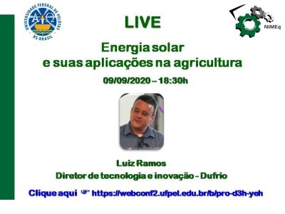 Na próxima quarta-feira, dia 09/09 às 18h30, a próxima live terá a participação do Diretor de Tecnologia e Inovação – Dufrio, Luiz Ramos, contando como a Energia Solar pode ser benéfica no meio agrícola e os melhores jeitos de aproveitá-la.