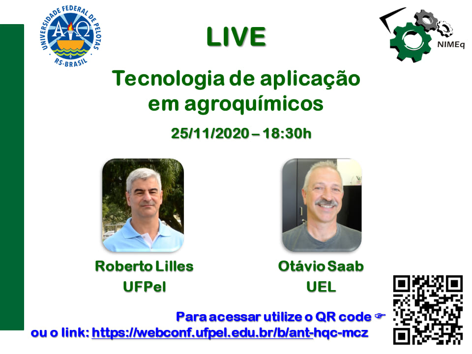 Nesta quarta-feira, 24/11 às 18h30, ocorrerá a 13ª live do projeto Ações de Interação Cognitiva da Área de Máquinas e Mecanização Agrícola no âmbito do COVID -19, com as participações do Prof. Dr. Roberto Lilles (UFPEL e Pesquisador do NIMEq) e do Prof. Dr. Otávio Saab (UEL), contando sobre novas tecnologias de aplicação em agroquímicos.