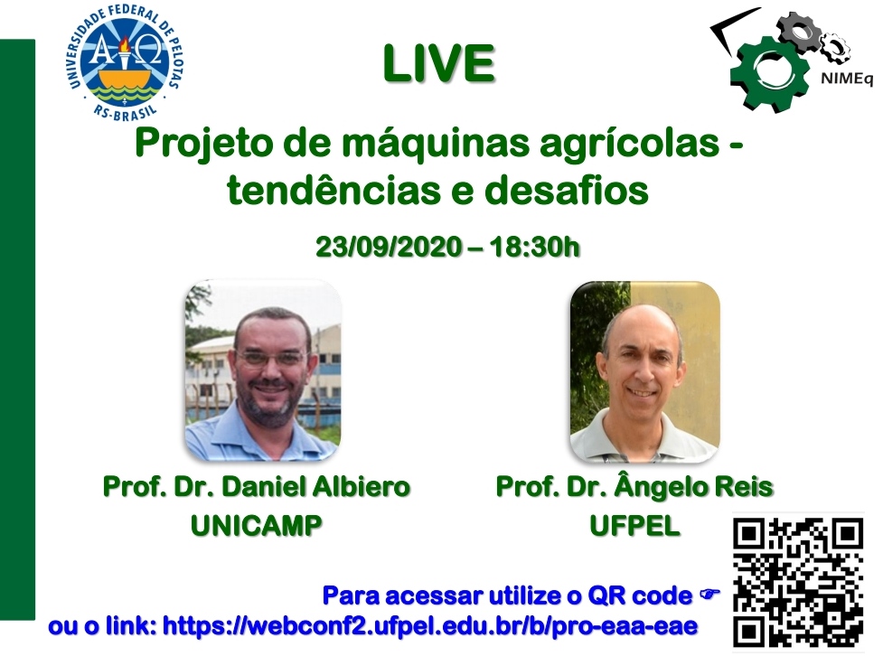 Dando seguimento no projeto Ações de Interação Cognitiva da Área de Máquinas e Mecanização Agrícola no âmbito do COVID -19, na próxima quarta-feira 23/09, às 18h30, teremos a sétima live, com as participações dos Prof. Dr. Daniel Albiero (UNICAMP) e do Prof. Dr. Ângelo Reis (UFPEL e Pesquisador do NIMEq), contando como nasce o projeto e construção de maquinários, o que podemos esperar do setor no futuro e claro, os desafios que surgem durante essa caminhada.
