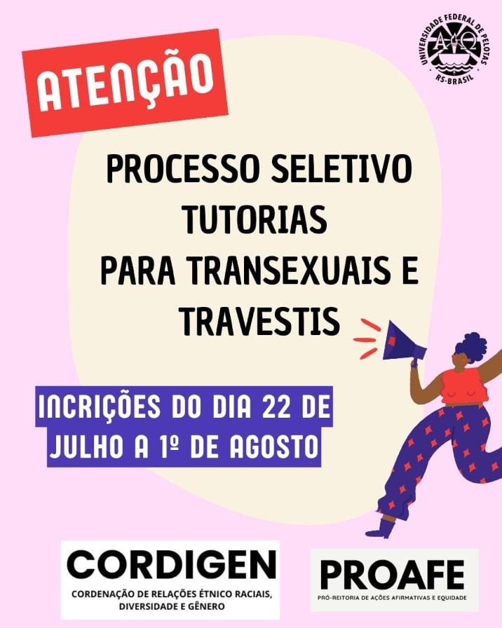 Está aberto o edital de processo seletivo a fim de selecionar tutores para transexuais e travestis da Cordigen.
