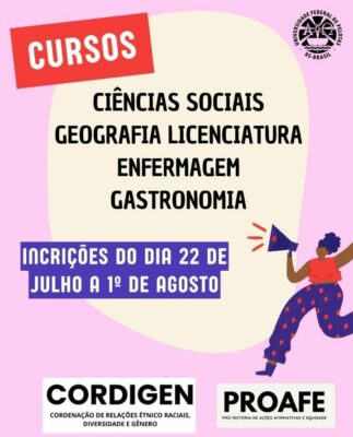 Serão 4 (quatro) vagas: 1 vaga para Geografia (Licenciatura), 1 vaga para Ciências Sociais (Licenciatura), 1 vaga para Gastronomia 1 vaga para Enfermagem.