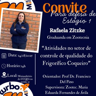 Convite para defesa de Estágio 1 🤓 O Time Turbo Metabolismo do NUPEEC-HUB convida para a defesa de Estágio Curricular Supervisionando I da graduanda em Zootecnia Rafaela Zitzke. O estágio foi realizado no Frigorífico Coqueiro, acompanhando as atividades do setor de controle de qualidade. 🥩👩🏻🔬 O relatório tem orientação do Prof Dr. Francisco Augusto Burkert …