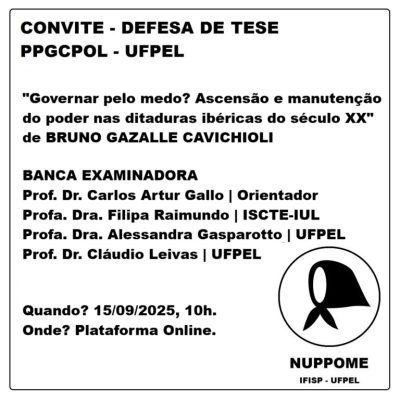 Entre os dias 05 e 07/11/2025, integrantes da equipe do NUPPOME participaram do “II Seminário Discente de Ciência Política” (SDCP), evento discente organizados pelos/as estudantes do Programa de Pós-Graduação em Ciência Política (PPGCPOL) da Universidade Federal de Pelotas (UFPEL). No evento, Carlos Artur Gallo, Bruno Gazalle Cavichioli e Laura Feijó de Souza, todas/os integrantes do Núcleo, coordenaram o GT 5 – Justiça de transição, memória e direitos humanos, no qual apresentaram resultados parciais de suas pesquisas as/os pós-graduandas/os: Aline Soares Araujo (trabalho sobre legados autoritários […]