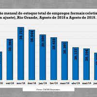 Segundo o Cadastro Geral de Empregados e Desempregados (CAGED) da Secretaria do Trabalho do Ministério da Economia, no mês de agosto de 2019 ocorreram, em Rio Grande, 1.245 admissões e 1.342 desligamentos, resultando em um saldo de -97 vínculos formais de emprego celetista. Com isso, a taxa de variação do emprego formal foi de -0,26%, com o estoque passando de 37.888 vínculos, em julho de 2019, para 37.791, em agosto de 2019. O saldo do mês de agosto de 2019 foi similar ao saldo observado […]