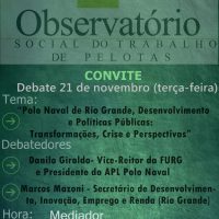 Em continuidade ao Ciclo de Debates sobre “Transformações do Trabalho e Papel do Estado nas Sociedades Contemporâneas”, o Observatório Social do Trabalho de Pelotas promove o terceiro debate com o tema “Polo Naval de Rio Grande, Desenvolvimento e Políticas Públicas: Transformações, Crise e Perspectivas”. O evento será realizado no próximo dia 21 de novembro, terça-feira, às 16 horas, na sala 206 do Instituto de Filosofia, Sociologia e Política da UFPel (IFISP), Campus Porto, prédio 1 (Rua Cel. Alberto Rosa, 154). PARTICIPANTES Os debatedores serão o […]