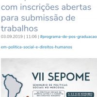 De 11 a 14 de novembro de 2019, realizar-se-á o VII Seminário de Políticas Sociais no Mercosul (SEPOME), intitulado “As políticas sociais na América Latina e a garantia dos direitos humanos”. O VII Sepome é promovido pelo Programa de Pós-Graduação em Política Social e Direitos Humanos da Universidade Católica de Pelotas. Conforme cronograma do evento, a inscrição de trabalhos está aberta. Os interessados deverão enviar resumos até o dia 27 de setembro para os Grupos de Trabalho do evento. Maiores detalhes sobre o evento, clique […]