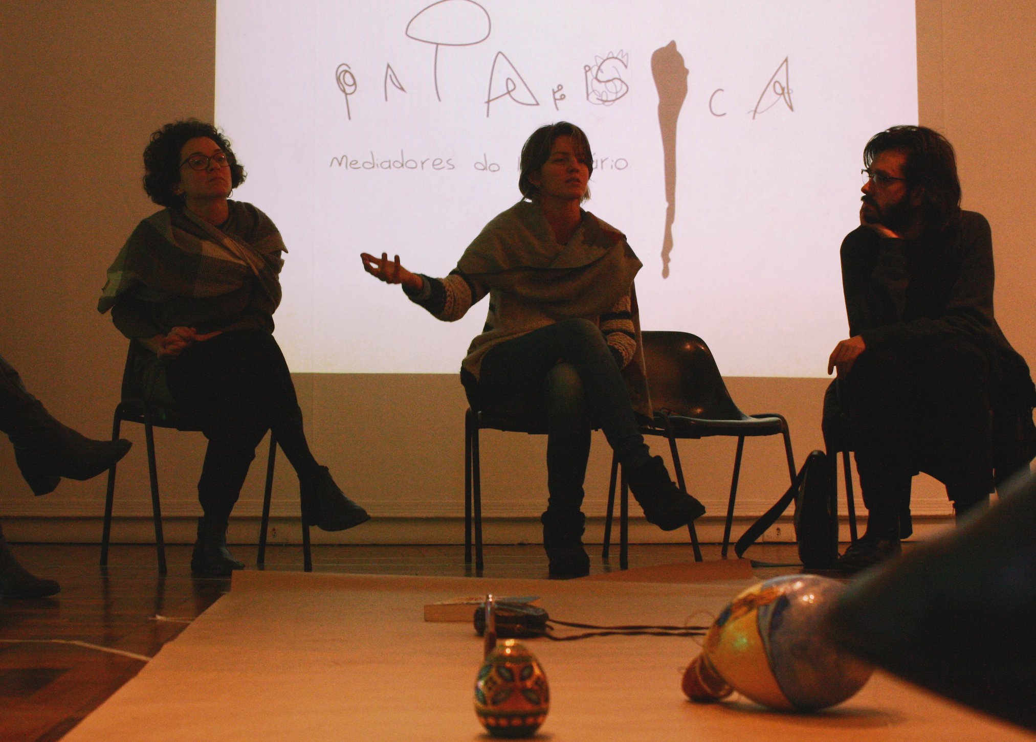 A prática patafísica é um híbrido entre oficina-conversa-encontro-acolhimento, uma mediação artística em sua experiência. Entre mediadores e mediados a metodologia para experiência artística começa numa conversa-troca que articula e propõe uma ação de criação.